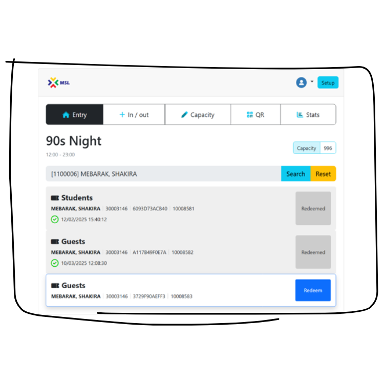 Security matters – especially for late-night venues and big-ticket events. The MSL Door Entry module doesn’t just check tickets; it helps you manage access responsibly. You’ll be automatically alerted if a student is under 18 or has been banned from entry, helping your staff make safe, confident decisions at the door.
